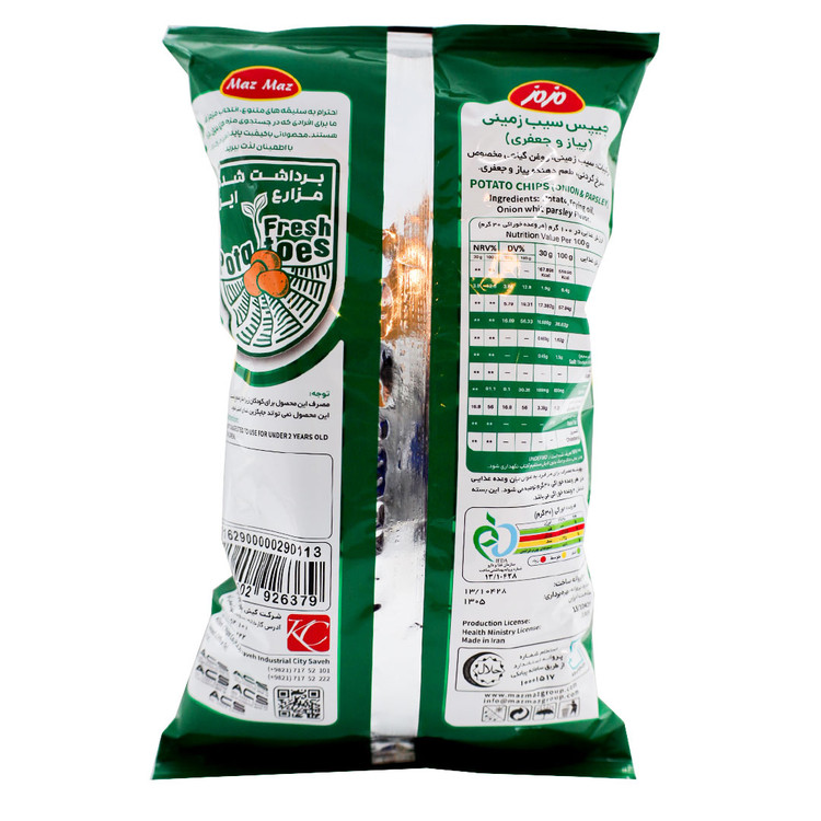 یکی از محبوبترین طعمهای این محصول، چیپس پیاز و جعفری مزمز (Maz Maz Onion And Parsley Chips) میباشد. وزن بستهبندی 65 گرمی بوده و برای دو نفر مناسب است. ارزش غذایی هر 30 گرم از این تنقلات محبوب شامل موارد زیر میباشد.