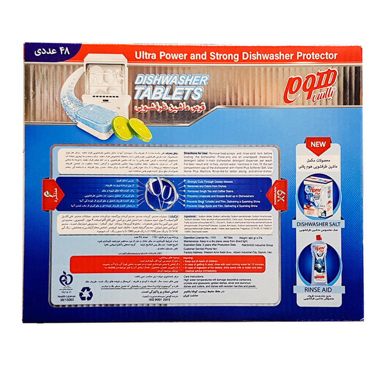 قرص ماشین ظرفشویی هوم پلاس مدل Lemon بسته 48 عددی امکانات و ویژگیهای مختلفی از جمله قدرت شویندگی، تمیز کنندگی و چربی زدایی دارد.نوع رایحه این قرص ماشین ظرفشویی هم لیمو بوده و کشور مبدا برند آن ایران است. سازمان غذا و دارو این قرص را تایید کرده است و در حال حاضر میتوانید این قرص را از فروشگاه دیجی کالا تهیه کنید.