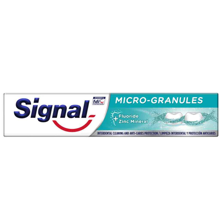 برای اینکه بتوانید از شر جرم و پلاک دندانها خلاص شوید و بین دندانهای خود را به صورت موثرتر تمیز کنید روزانه دو مرتبه از خمیر دندان سیگنال مدل Micro-Granules برای شستشوی دندانهای خود استفاده کنید. این خمیر دندان با فرمولاسیون حاوی فلوراید و ماده معدنی روی ضمن شستشوی بی نقص دندانها، قادر است استحکام و مقاومت آنها را نیز افزایش دهد و مانع از خرابی زود هنگام دندانها شود.